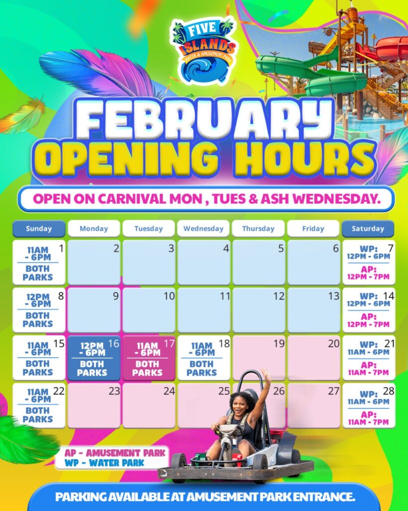 👉 Ready to trade the mas for the park? Whether you’re looking for a post-Carnival cool down or a weekend thrill, Five Islands has you covered this February! 🌊🎢